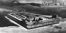 Предполагаемый общий вид перспективного судна на воздушной подушке для перевозки 2000 легковых автомобилей.
