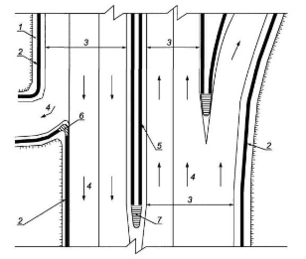 1 – обочина; 2 – боковое одностороннее ограждение; 3 – проезжая часть; 4 – направление потока; 5 – боковое двустороннее ограждение; 6 – фронтальное одностороннее ограждение; 7 – фронтальное двустороннее ограждение