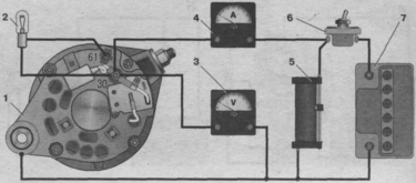 Рис. 4.1. Схема з'єднань для перевірки генератора 37.3701 на стенді: 1 - генератор; 2 - контрольна лампа 12 В, 3 Вт; 3 - вольтметр; 4 - амперметр; 5 - реостат; 6 - вимикач; 7 - акумуляторна батарея.
