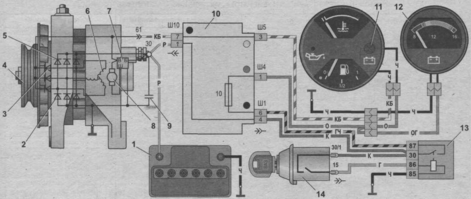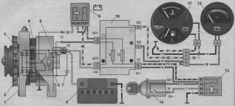 Рис. 1.3. Схема з'єднань системи генератора Г-222: 1 - генератор; 2 - негативний діод; 3 - позитивний діод; 4 - обмотка статора; 5 - регулятор напруги; 6 - обмотка ротора; 7 - конденсатор для придушення радіоперешкод; 8 - акумуляторна батарея; 9 - реле контрольної лампи заряду aккумуляторної батареї; 10 - монтажний блок; 11 - контрольна лампа заряду акумуляторної батареї в комбінації приладів; 12 - вольтметр; 13 - реле запалювання; 14 - вимикач запалювання
