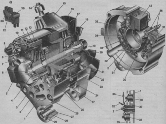 Рис. 1.2. Генератор 37.3701: а - регулятор напруги і щітковий вузол у генераторів випуску з 1996 р.; 1 - кришка генератора з боку контактних кілець; 2 - болт кріплення випрямного блоку; 3 - контактні кільця; 4 - кульковий підшипник вала ротора з боку контактних кілець; 5 - конденсатор 2,2 мкф ±20% для придушення радіоперешкод; 6 - вал ротора; 7 - провід загального виходу позитивних діодів; 8 - затискач "30" генератора для підключення споживачів; 9 - штекер "61 "генератора (загальний вихід додаткових діодів); 10 - провід виходу "Б" регулятора напруги; 11 - щітка, з'єднана з виходом "В" регулятора напруги; 12-регулятор напруги; 13 - щітка, з'єднана з виходом "Ш" регулятора напруги; 14 - шпилька для кріплення генератора до натяжного пристрою; 15 - кришка генератора з боку приводу; 16 - крильчатка вентилятора зі шківом приводу генератора; 17 - полюсний наконечник ротора; 18 - шайби кріплення підшипника; 19 - дистанційне кільце; 20 - кульковий підшипник вала ротора з боку приводу; 21 - сталева втулка; 22 - обмотка ротора (обмотка збудження); 23 - осердя статора; 24 - обмотка статора; 25 - випрямний блок; 26 - стяжний болт генератора; 27 - буферна втулка; 28 - втулка; 29 - підтискна втулка; 30 - негативний діод; 31 - ізолююча пластина; 32 - фазний вихід обмотки статора; 33 - позитивний діод; 34 - додатковий діод; 35 - тримач позитивних діодів; 36 - ізолюючі втулки; 37 - тримач негативних діодів; 38 – вихід "В" регулятора напруги; 39 – щіткотримач.