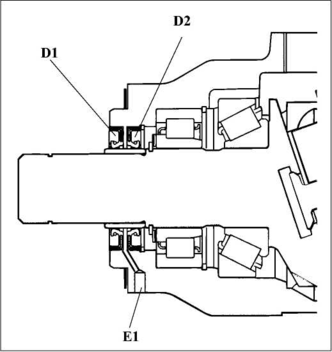 Ущільнення між насосом і коробкою відбору потужності повинне проводитися двома ущільнювальними кільцями (D1 + D2) і випуском повітря (E1) між кільцями ущільнювачів.