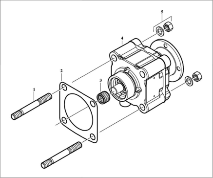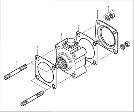 4 Насос і коробку відбору потужності з новою прокладкою (2) насадити і пригвинтити 4 шестигранними гайками (5) з шайбами.