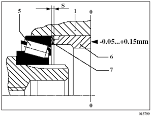 У процесі вимірювання і відповідно установки обидва конічних роликових підшипника повинні бути без зазору, однак без осьового попереднього натягу. Беззазорний стан конічних роликів досягається натиском зовнішнього кільця підшипника з боку валу відбору потужності при одночасному багаторазовому прокручуванні проміжного вала. Товщина "S" встановлюється такий, щоб втулка по відношенню до площини корпусу заглиблювалася на макс. 0,05 мм або виступала на макс. 0,15 мм.