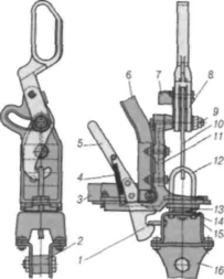 1 – скоба запобіжного гака; 2 – ресора; 3 – подовжня балка підлоги кабіни; 4 – пружина; 5 – запобіжний гак; б – балка заду кабіни; 7 – упор; 8 – рукоятка; 9 – вісь замка; 10 – гак; / / – корпус; 12 – скоба; 13 – гумова подушка; 14 – прокладка; 15 – кронштейн; 16 – обойма ресори