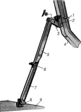 Обмежувач підйому кабіни (рис. 1.4) розташований з правого боку кабіни. Нижня стійка 7 обмежувача обертається в скобі 8, закріпленій на правому лонжероні 9 рами. Верхня стійка 5 через подовжувач 3 кріпиться в скобі 2, закріпленій на подовжній балці 4 підлоги кабіни. При піднятій кабіні обидві стійки створюють упор який перешкоджає мимовільному опусканню кабіни. Для запобігання випадкового складання обмежувача є запобіжний гачок-заскочка 6 між нижньою і верхньою стійками. Піднявши кабіну, необхідно натиснути на стійку обмежувача так, щоб заскочка зайшла в зчеплення з язичком верхньої стійки. При опусканні кабіни необхідно цю заскочку відтягнути і подати обмежувач на себе, притримуючи кабіну рукою.