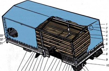 1 – тент платформи; 2 – вентиляційний клапан; 3 – дуга каркаса тенту; 4 – розпірка дуг тенту; 5 – стяжний ланцюг стійок бортів; 6 – трос пломбування; 7 – клапан пломбування; 8 – заднє обв'язування основи; 9 – балка каркаса основи; 10 – подовжній брус основи; 11 – задній борт; 12 – кутовий замок бортів; 13 – бризковик; 14 – заднє бічне обв'язування основи; 15 – замок стійки каркаса тенту; 16 – дошка каркаса тенту; 17 – підсилювач основи; 18 – задня стійка каркаса тенту; 19 – щит підлоги; 20 – задній бічний борт; 21 – хомут; 22 – лонжерон рами; 23 – поперечна балка; 24 – стійка бічних бортів; 25 – бічний замок; 26 – середня стійка каркаса тенту; 27 – передній бічний борт; 28 – переднє бічне обв'язування; 29 – розпірка стійок каркаса тенту; 30 – інструментальний ящик; 31 – ремінь клапана тенту; 32 – передній борт; 33 – надставка переднього борту