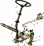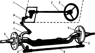 Розташування й взаємодію деталей рульового керування, що не має підсилювача, можна розглянути на спрощеній схемі рис.2. Тут рульовий механізм складається з рульового колеса З, рульового вала 2 та рульового механізму 1, утвореної зчепленням черв'ячної шестірні (черв'яка) із зубчастим сектором, на вал якого кріпиться сошка 9 рульового приводу. Сошка та решта деталей рульового керування - подовжня тяга 8, поворотний важіль 7, поворотні важелі 5 лівої та правої поворотних цапф, поперечна тяга 6 - складають рульовий привод.