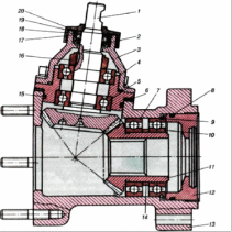 1 - ведуча шестірня; 2 - манжета; 3 - кришка корпусу; 4 - корпус ведучої шестірні; 5, 7 і 10 - кулькові підшипники; 6 - регулювальні прокладки; 8, 15 і 19 - ущільнювальні кільця; 9 - стопорне кільце; 11 - ведена шестірня; 12 - упорна кришка; 13 - корпус редуктора; 14 - розпірна втулка; 16 - гайка кріплення підшипників; 17 - шайба; 18 - упорне кільце; 20 - захисна кришка