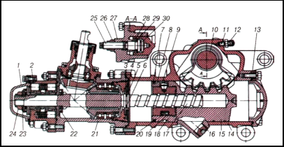 1 - передня кришка; 2 - клапан керування гідропідсилювачем; 3, 28 - стопорні кільця; 4 - плаваюча втулка; 5,7 - ущільнювальні кільця; 6,8 - розпірні кільця; 9 - установлювальний гвинт; 10 - вал сошки; 11 - перепускний клапан; 12 - захисний ковпачок; 13 - задня кришка; 14 - картер рульового механізму; 15 - поршень-рейка; 16 - зливна магнітна пробка; 17 - гвинт; 18 - кулькова гайка; 19 - жолоб; 20 - кулька; 21 - кутовий редуктор; 22 - упорний роликопідшипник; 23 - пружинна шайба; 24, 26 - гайки; 25 - регулювальний гвинт; 27 - бічна кришка; 29 - регулювальна шайба; 30 - упорна шайба