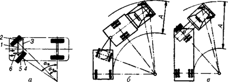 Рис.1.1 Схема повороту автомобіля (а), автопоїзда в складі тягача з причепом (б) та тягача з напівпричепом (в): 1 - балка; 2,4 - відповідно правий та лівий поворотні важелі; 3,6 - відповідно поперечна й подовжня тяги; 5 - поворотна цапфа; А - ширина смуги руху
