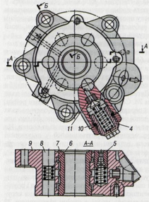 Клапан керування гідропідсилювачем рульового керування (рис.2.5) кріпиться до корпусу кутового редуктора за допомогою болта і чотирьох шпильок. Корпус 9 клапана має виконані з великою точністю центральний отвір і шість (три наскрізних і три глухих) розташованих навкруг нього менших отворів. Золотник 7 клапана керування розміщений в центральному отворі, а упорні підшипники 22 (див. рис.2.4) закріплені на гвинті гайкою 24, буртик якої втиснено у паз гвинта 17. Під гайку підкладена конічна пружинна шайба 23, що забезпечує можливість регулювання сили затягування упорних підшипників. Увігнутою стороною шайба направлена до підшипника. Великі кільця роликопідшипників повернені до золотника.