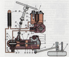 1 - рульове колесо; 2 - трубка фільтра; 3 - фільтр; 4 - насос; 5 - перепускний клапан; 6 - вал сошки; 7, 25 - порожнина; 8 - поршень-рейка; 9 - сошка; 10 - подовжня рульова тяга; 11 - поперечна рульова тяга; 12 - колесо; 13 - зливна пробка; 14 - кулькова гайка; 15 - гвинт; 16 - поршень-рейка; 17 - кульковий підшипник; 18 - запобіжний клапан; 19 - корпус розподільника; 20 - золотник; 21 - пружинна шайба; 22 - реактивний плунжер; 23 - пружина; 24 - картер рульового механізму; 26 - лінія нагнітання; 27 - карданний вал; 28 - радіатор; 29 - рульова колонка; 30 - заливний фільтр; 31 - бачок; 32 - лінія зливу; 33 - пружина; 34 - запобіжний клапан; 35 - гніздо клапана