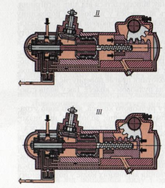 При цьому золотник не доходить до середнього положення. Розмір щілини для проходу масла в зливну лінію стає таким, що в порожнині циліндра, який знаходиться під натиском, підтримується тиск, необхідний для утримування керованих коліс у поверненому положенні.