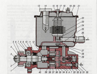 1 - шестірня приводу; 2 - гайка кріплення шестірні; 3 - шплінт; 4, 15 - шайби; 5 - вал насоса; 6 - сегментна шпонка; 7, 10 - упорні кільця; 8 - кульковий підшипник; 9 - масловідгінне кільце; 11 - манжета; 12 - голчастий підшипник; 13 - кришка заливної горловини; 14 - заливний фільтр; 16 - болт; 17, 36, 39 - ущільнювальні кільця; 18 - труба фільтра; 19 - запобіжний клапан; 20 - кришка; 21, 28 - ущільнювальні прокладки; 22 - бачок; 23 - фільтруючий елемент; 24 - колектор; 25 - трубка бачка; 26 - штуцер; 27 - прокладка колектора; 29 - кришка насоса; 30 - пружина перепускного клапана; 31 - сідло запобіжного клапана; 32 - регулювальні шайби; 33 - перепускний клапан у зборі із запобіжним клапаном; 34 - розподільний диск; 35 - пластина насоса; 37 - статор; 38 - ротор; 40 - корпус насоса; А, Б - дросельні отвори; В - порожнина нагнітання; Г - радіальні отвори; І - з системи; II - в систему