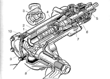 1-картер; 2 — гвинт; 3— гайка; 4 — кульки; 5— рульовий вал; 6 — корпус клапана; 7— золотник; 8— вал сошки; 9 — зубчастий сектор; 10 - поршень-рейка
