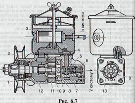 Насос гідропідсилювача (рис. 1.4) лопатевого типу приводиться в дію від шківа колінчастого вала двигуна клинопасовою передачею через шків 2, закріплений на валу 12 насоса. Вал обертається на кульковому й роликовому підшипниках у корпусі 1 насоса. На шліцьовому кінці вала закріплено ротор 10, який уміщено всередині статора 11. Статор затиснуто між кришкою 4 й корпусом 1 насоса за допомогою болтів. У порожнині статора ротор ущільнюється лопатями 13, закладеними в його пази. Всередині кришки насоса вміщено розподільний диск 9, який своєю торцевою поверхнею притискається за допомогою пружини перепускного клапана 7 до статора. Всередині перепускного клапана встановлено кульковий запобіжний клапан 5, притиснутий пружиною до сідла 6 запобіжного клапана. Зверху до корпусу й кришки прикріплено бачок 3, що має сапун і сітчасті фільтри для оливи.