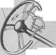 Величину люфту (вільного ходу) визначають люфтомером, коли передні колеса встановлені в положення, що відповідає руху автомобіля по прямій. Стрілку люфтомера встановлюють на спиці кермового колеса чи на його ободі за допомогою пружинного затиску (рис. 2.3.), а на кожусі кермового стовпчика нижче кермового колеса закріплюють шкалу люфтомера. Після того, як кермове колесо повернене до положення початку повороту передніх коліс, нульову оцінку шкали встановлюють проти стрілки. Потім, повертаючи кермове колесо в зворотному напрямку, до початку повороту передніх коліс за поділками на шкалі, проти яких виявиться стрілка люфтомера, визначають люфт рульового колеса.