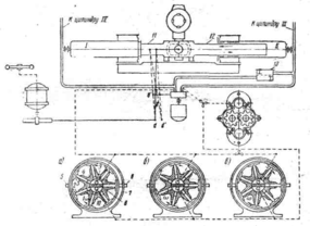 Сервомотор обеспечивает работу машин и в том случае, когда в процессе перекладки руля удар волны (или другое внешнее воздействие) заставит сработать механизм возврата золотника, так как при этом руль несколько отклонится и своим движением посредством сервомотора снова закроет окно а, после чего поворот руля будет продолжаться до заданного угла перекладки.