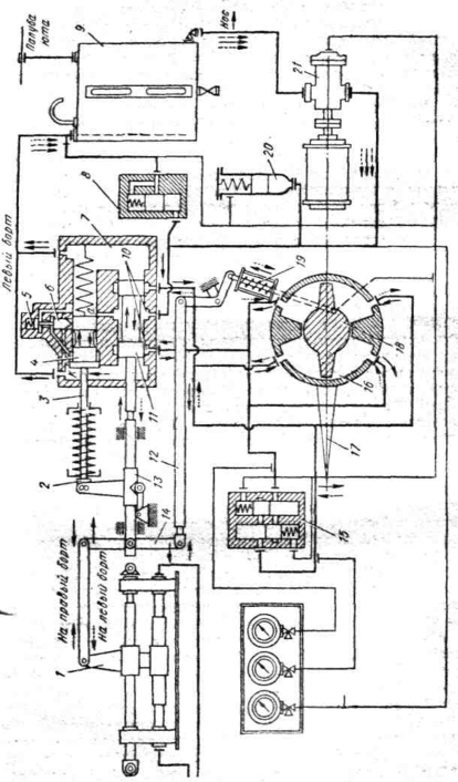 При нагнетании жидкости в две диаметрально противоположные полости цилиндра вал с крыльями и баллер 18 руля 17 поворачиваются в данном случае против часовой стрелки. Поворот баллера вызовет перемещение рычага 12 сервомотора (обратная связь), при этом рычаг 14 поворачивается и смещает золотник до тех пор, пока закроются окна 10 золотниковой коробки, а кулачковое устройство 13 станет в первоначальное положение. Давление рабочей жидкости на кольцевую поверхность разгрузочного золотника 4 совпадает с направлением действия пружин, в результате чего этот золотник сместится и откроет канал а, вследствие чего возобновится циркуляция жидкости по кольцу/указанному пунктирными стрелками. В результате руль останется в переложенном на борт положении и показания аксиометра будут соответствовать ранее заданному углу перекладки. Можно проследить по схеме, что при вращении штурвала в левую сторону баллер повернется по часовой стрелке.