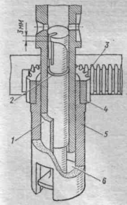 Одна из конструкций механизма поворота плунжера (рис. 7): на втулку 1 свободно надета поворотная втулка 5 с закрепленным на ней зубчатым венцом 4; крестовина 6, отфрезерованная заодно с плунжером 2, входит в прямоугольные пазы поворотной втулки; зубчатая рейка 3, связанная с общей для всех ТНВД тягой управления топливоподачей, входит в зацепление с зубчатым венцом поворотной втулки; передвигаясь с помощью тяги управления, рейки разворачивают все плунжеры ТНВД на одинаковый угол, изменяя величину цикловой подачи.