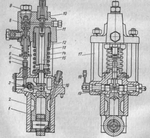 втулка плунжера 14, плунжер 15 опирается на толкатель 2; ролик толкателя 1 катится по кулачной шайбе и прижимается к ней пружиной 13; в корпусе насоса размещаются нагнетательный 10 и перепускной 8 клапаны; канал над клапаном 8 закрывается пробкой 9, под которой ставят заглушку; клапан приводится в действие от составного толкателя (7 и 4) с регулировочным винтом 6, который фиксируется гайкой 5; отсечной рычаг 16 опирается на шейку 3 эксцентрикового валика 19, на конец которого насажен рычаг 18 для присоединения к общей тяге управления топливоподачей ,(17 — корпус толкателя).