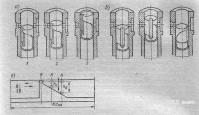 Втулка имеет одно или два окна, сообщающихся с приемной полостью насоса; открытием и закрытием окон управляет плунжер. На рис. 6, а показаны положения плунжера, соответствующие: