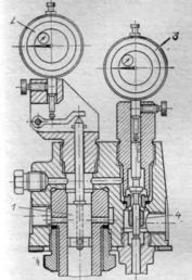 Для клапанных насосов геометрическое начало подачи соответствует посадке перепускного клапана ( рис. 2 и 4) на гнездо. В формуляре двигателя указывают величину хода плунжера ТНВД в момент начала подачи топлива и угол опережения подачи. Для проверки над перепускным клапаном 4 ставят второй индикатор 3 ( рис. 9).