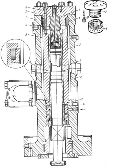 ТНВД двигателей Бурмейстер и Вайн типа ДКЗРН (рис. 8). В корпусе 1 насоса устанавливается съемная втулка 5 с запрессованной стальной тонкостенной втулкой 6, которая центрируется сверху корпусом 4 всасывающего клапана. Верхняя часть корпуса входит в крышку 2. Внизу втулка имеет посадочный пояс для центровки в корпусе насоса. Два резиновых кольца 9, поставленных в канавки посадочного пояса, предотвращают попадание топлива в смазочное масло толкателя. Выше посадочного пояса между втулкой и корпусом находится приемная полость насоса. Через отверстие V топливо поступает в приемную полость, поднимается вверх к корпусу всасывающего клапана.