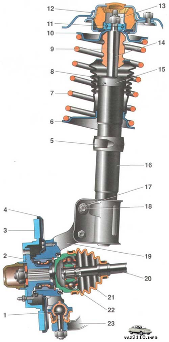 1 - шаровая опора; 2 - ступица; 3 - тормозной диск; 4 - защитный кожух; 5 - поворотный рычаг; 6 - нижняя опорная чашка; 7 - пружина подвески; 8 - защитный чехол телескопической стойки; 9 - буфер сжатия; 10 - верхняя опорная чашка; 11 - подшипник верхней опоры; 12 - верхняя опора стойки; 13 - гайка штока; 14 - шток; 15 - опора буфера сжатия; 16 - телескопическая стойка; 17 - гайка; 18 - эксцентриковый болт; 19 - поворотный кулак; 20 - вал привода переднего колеса; 21 - защитный чехол шарнира; 22 - наружный шарнир вала; 23 - нижний рычаг.