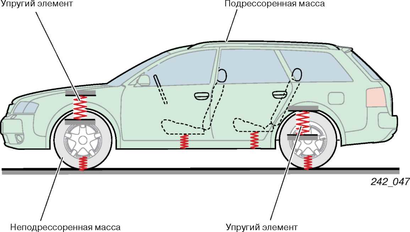 Существуют понятия подрессоренные массы автомобиля (кузов с трансмиссией и частично ходовая часть) и неподрессоренные массы автомобиля (колёса с тормозными механизмами, а также частично массы ходовой части и приводных валов).