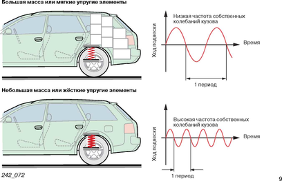 Частота собственных колебаний кузова в основном определяется характеристиками упругих элементов (жёсткостью) и величиной подрессоренной массы.