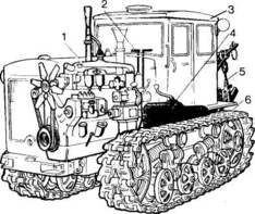 Основные части трактора. Их расположение показано на рис.1. Независимо от особенностей конструкции тракторы состоят из двигателя 1, трансмиссии 4, ходовой части 6, механизма управления 2, рабочего 5 и вспомогательного 3 оборудования.