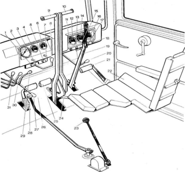 Для управления трактором в кабине расположены следующие рычаги и педали [3, с. 19].