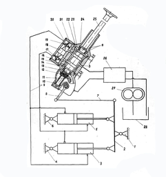 1 - вертикальний шарнір рами; 2 - поворотні важелі силових циліндрів; 3,5 - силові поворотні циліндри; 4,6 - кронштейни кріплення силових циліндрів; 7 - тяга зворотного зв'язку; 8 - сошки; 9 - трубопроводи; 10 - чавунний картер; 11 - сектор; 12 - черв’як; 13 - вал; 14,22 - упорні шайби; 15 - втулка золотника; 16 - золотник; 17,20 - грибкові клапани запірного клапана; 18-плунжер запірного клапана; 19 - корпус запірного клапана; 21 - корпус розподільника (ГПК); 23 - верхня кришка; 24 - роликовий підшипник; 25-рульова колонка; 26-клапан витрати; 27-шестерінчастий насос; 28 – бак.