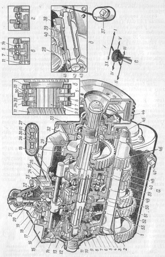 а — складена; б — синхронізатор; в і г — схеми дії синхронізатора; д — шестірні, що включаються при передачі заднього ходу (передача включена); є — положення важеля переключення передач; 1 — чавунний картер; 2, 48, 49, 52 — косозубчасті шестірні проміжного вала; 3 — проміжний вал; 4 — роликовий підшипник; 5 — каретка синхронізатора; 6 — блокуючі пальці; 7 — кільце; 8 — внутрішній зубчастий вінець; 9 — ведений вал; 10 — роликовий підшипник; 11 — ведучий вал; 12 — кришка підшипника; 13 — кульковий підшипник; 14 — корпус фіксатора; 15, 26 і 27 — повзуни; 16 — кришка картера; 17 — штифтовий запобіжник; 18 — проміжний важіль; 19 — вісь; 20 — важіль переключання передач; 21 — фіксуючий палець; 22 і 23 — вилки; 24 — пружина фіксатора; 25 — кулька; 28 — прямозубчаста шестірня; 29 — болт; 80 — штифт; 31 — кулька; 32 — кульковий підшипник; 33 — шестірня привода спідометра; 34 — опорний палець; 35 — кулька; 36 — пружина; 37 — пробка; 38 і 41 — шестірні блока; 39 — прямозубчаста шестірня проміжного вала; 40, 50 і 51 — косезубчасті шестірні веденого вала; 42 — вісь блока шестерень; 43 — стопорна пластина; 44 — барабан; 45 — кульковий підшипник; 46 — шестірня; 47 — зливна пробка; 53 — розпірна втулка.