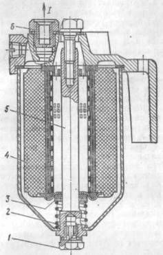 Пристрій фільтра тонкого очищення показано на мал. 3. Він служить для більш ретельного очищення палива. Через середину корпуса цього фільтра проходить стрижень 5, на який надітий фільтруючий елемент 4 у виді сталевого сітчастого каркаса. Усередині каркаса проходить трубка з отворами, обмотана тканиною. На тканину нанесений спеціальний состав (деревне борошно, просочене пульвербакелитом), поверх якого накладено кілька витків марлі. З торців фільтруючий елемент закритий пластинчастими фланцями. До кришки корпуса фільтра елемент притискається циліндричною пружиною 2 за допомогою шайби 3. У кришці розташований жиклер 6, через який у зливальний трубопровід проходить частина палива і повітря, що потрапила в систему. Відстій зливається через пробку 1.