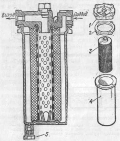 1 - кришка; 2 - прокладка; 3 - фільтруючий елемент; 4 - корпус; 5 - пробка для зливу відстою