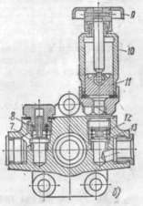 а - основний насос, що подає; б - ручний насос, що підкачує; І - корпус; 2 - дренажний канал; 3 і ІІ - поршні; 4 - возпратная пружина поршня; 5 - пробка; 6 - шток; 7 і 13 - клапани; 8 і 12 - пружини; 9 - рукоятка; 10 - цнлиндр ручного насоса