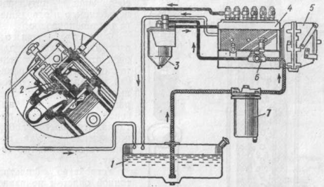 Принципова схема системи живлення дизельного двигуна показана на мал. 1. Насос низького тиску 6 (практично цей насос установлюють звичайно на корпусі насоса високого тиску) засмоктує паливо з бака 1 через фільтр грубого очищення 7 у свою порожнину усмоктування. Далі цей насос нагнітає паливо через фільтр тонкого очищення 3, у паливний насос високого тиску 4. Останній упорскує його через форсунки 2 безпосередньо в камери згоряння двигуна. Надлишкове паливо разом з повітрям, що потрапило в систему, відводяться по дренажних трубках у паливний бак. У нього також зливається паливо, що проникло в порожнини пружин форсунок. Паливні баки, застосовувані на автомобілях з дизельними двигунами, розраховані на великий запас ходу (350-400 км); установлюють їх на кронштейнах, закріплюючи хомутами.