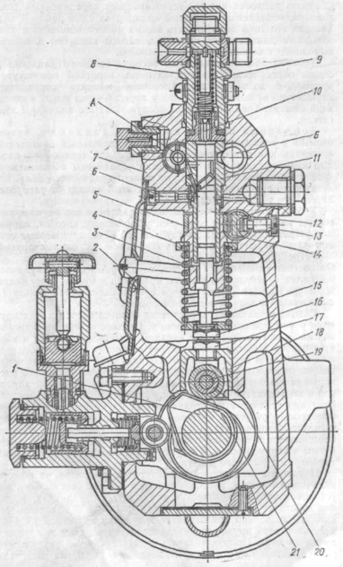1 - кулачковый вал; 2 - нижня тарілка; 3 - поворотна втулка; 4 - верхня тарілка; 5 - зубцюватий сектор; 6 - стопорний гвинт; 7 - корпус; 8 - штуцер; 9 - пружина нагнітального клапана; 10 - нагнітальний клапан; 11 - гільза; 12 - плунжер; 13 - гвинт обмеження ходу рейки; 14 - пальці ведучої напівмуфти; 15 - пружина; 16 - регулювальний БИНТ; 17 - контргайка; 18 - штовхальник; 19 - вісь ролика; 20 - втулка, що плаває; 21 - ролик; А и Б - канали відводу і підведення палива