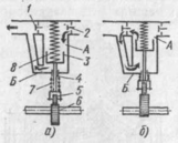 а - рух поршня вниз - паливо подається до насоса високого тиску; б - рух поршня нагору - паливо заповнює порожнину Б; 1 - нагнітальний і 2 - впускний клапани; 3 - поршень; 4 - шток; 5 - ролик; 6 - кулачок вала приводу; 7 і 8 - пружини; А и Б - порожнини