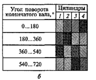 Рис. 5. Схема (а) и таблица (б) порядка работы четырехцилиндрового двигателя: 1, 2, 3, 4 — цилиндры двигателя