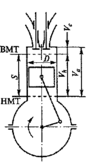 Рассмотрим основные параметры двигателя, связанные с его работой (рис. 2). Верхняя мертвая точка (ВМТ) — крайнее верхнее положение поршня. В этой точке поршень наиболее удален от оси коленчатого вала. Нижняя мертвая точка (НМТ) — крайнее нижнее положение поршня. Поршень наиболее приближен к оси коленчатого вала. В мертвых точках поршень меняет направление движения, и его скорость равна нулю. Ход поршня (S) — расстояние между мертвыми точками, проходимое поршнем в течение одного такта рабочего цикла двигателя. Каждому ходу поршня соответствует поворот коленчатого вала на угол 180° (пол-оборота). Такт — часть рабочего цикла двигателя, происходящего при движении поршня из одного крайнего положения в другое. Рабочий объем цилиндра (Vk) — объем, освобождаемый поршнем при его перемещении от ВМТ до НМТ. Объем камеры сгорания (Vc) — объем пространства над поршнем, находящимся в ВМТ. Полный объем цилиндра (Va) — объем пространства над поршнем, находящимся в НМТ: