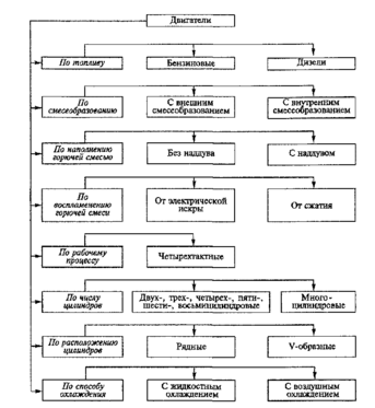 Рис.1. Основные типы автомобильных двигателей, классифицированных по различным признакам