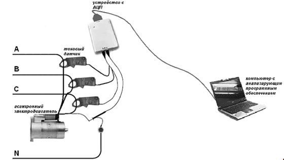 Наиболее удачным методом является использование программно-аппаратного комплекса, который изображен на рис. 1, состоящего из компьютера и цифрового устройства-посредника, производящего необходимые измерения и передаваемого их в компьютер. В качестве измеряемых электрических величин могут быть оперативный ток, потребляемая мощность и т.д. Программа, выполняемая на компьютере, должна, в свою очередь, определенным образом обработать входную информацию и определить наиболее вероятный вид повреждения работающего электродвигателя или сделать заключение об его исправности. Этот метод наиболее эффективен, так как позволяет хранить на компьютере большие базы данных с информацией об отслеживаемой динамике повреждений электродвигателя с последующим прогнозированием выхода его из строя.