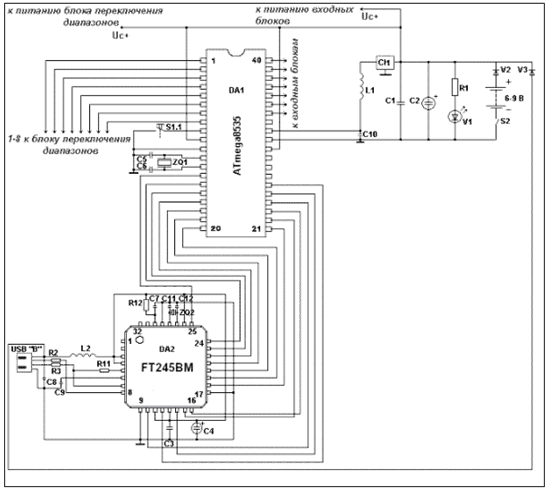 В качестве основы для реализации измерительного блока, принципиальная схема которого изображена на рис. 3, был выбран недорогой микроконтроллер фирмы ATMEL ATmega8535 RISC-архитектуры со встроенным 8-канальным аналого-цифровым преобразователем (АЦП) /14/. Данный микроконтроллер имеет 512 байт энергонезависимой памяти EEPROM, которую можно использовать для хранения калибровочных коэффициентов и настроек, относящихся к диагностируемому электродвигателю. Микросхема FT245BM используется для связи измерительного блока с компьютером через интерфейс USB 2.0. Однако возникли дополнительные трудности, связанные с низким быстродействием АЦП данного микроконтроллера, в результате чего получается слишком мало экспериментальных значений измеряемой величины на анализируемом периоде сигнала электродвигателя. Можно воспользоваться более мощным и быстрым многоканальным АЦП или несколькими одноканальными АЦП, работающими параллельно, однако оба этих способа значительно завысят себестоимость аппаратной части комплекса. Решением этой проблемы стал программный метод, при помощи которого происходит получение более детального графика сигнала на одном периоде путем анализа сразу нескольких периодов сигнала.