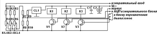 Напряжение с токовых датчиков или с фаз электродвигателя подается на измерительный вход входного блока, изображенного на рис. 6. Входное напряжение подается через один их трех делителей в зависимости от текущего диапазона напряжения. Каждый делитель подключается при помощи реле, после получения соответствующего сигнала на базу одного из трех транзисторов от блока переключения диапазонов. Реле во входном блоке являются герконовыми, так как они потребляют небольшой ток и при этом сравнительно бесшумны. Текущий входной делитель выбирается блоком переключения диапазонов таким образом, чтобы на выходе делителя уровень напряжения был в пределах от -1,25 В до 1,25 В. Но учитывая, что аналого-цифровой преобразователь микроконтроллера выполняет измерение только неотрицательных сигналов от 0 до 2,5 В, дополнительно на выходной сигнал подается постоянное напряжение смещения с интегрального стабилизатора CL1 через делитель R9 и R10, на выходе которого образуется +1,25 В.