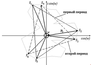 Идея метода изображена на рис. 4. На координатной плоскости рисунка имеются радиус-векторы, вращающиеся с угловой скоростью wt. Длина радиус-вектора равна текущему значению полной потребляемой мощности Pi. Таким образом, текущее состояние сигнала удобно представить в виде комплексного числа i, значение которого можно выразить через формулу Коши-Адамара: