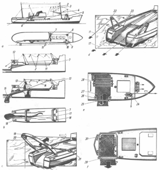 1 — кормовая грузовая стрела; 2 — блоки на штаг-кариаке; 3 — гинь-тали; 4 — носовая грузовая стрела; 5 — носовая тралевая дуга; 6 — кормовая траловая дуга; 7 — траловая лебедка; 8 — центральный роульс; 9 — коренной ролик траловой дуги; 10 — бортовой роульс; 11 — ваеры; 12 — кормовой бортовой ваерный ролик; 13 — подвесной блок; 14 — оттяжка; 15 — куток; 16 — барабан для вытяжного троса; 17 — вытяжной трос; 18 — распорная (траловая) доска; 19 — качающаяся траловая дуга; 20 — подвесной блок траловой дуги; 21 — гидравлический цилиндр— 22 — траловая дуга донного трала; 23 — подвесной направляющий ролик; 24 — шпиль дрифтерной сети; 25 — бортовой рог дрифтерной сети; 26 — сетевыборочная машина; 27 — дрифтерная сеть; 28 — сететрясная машина; 29 — рол; 30 — мелководная ставная сеть.